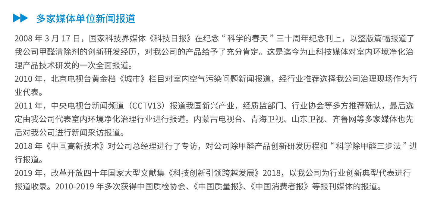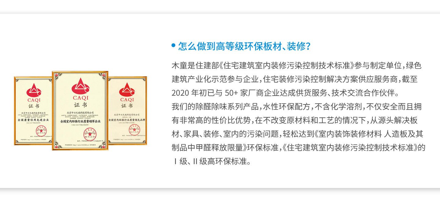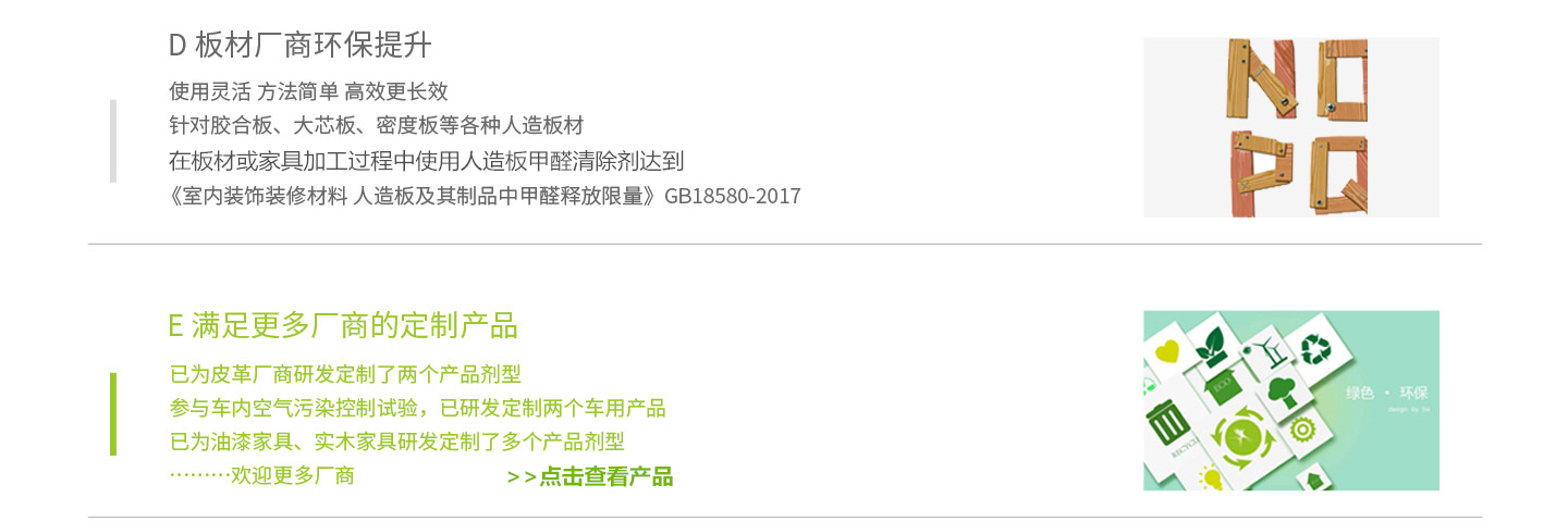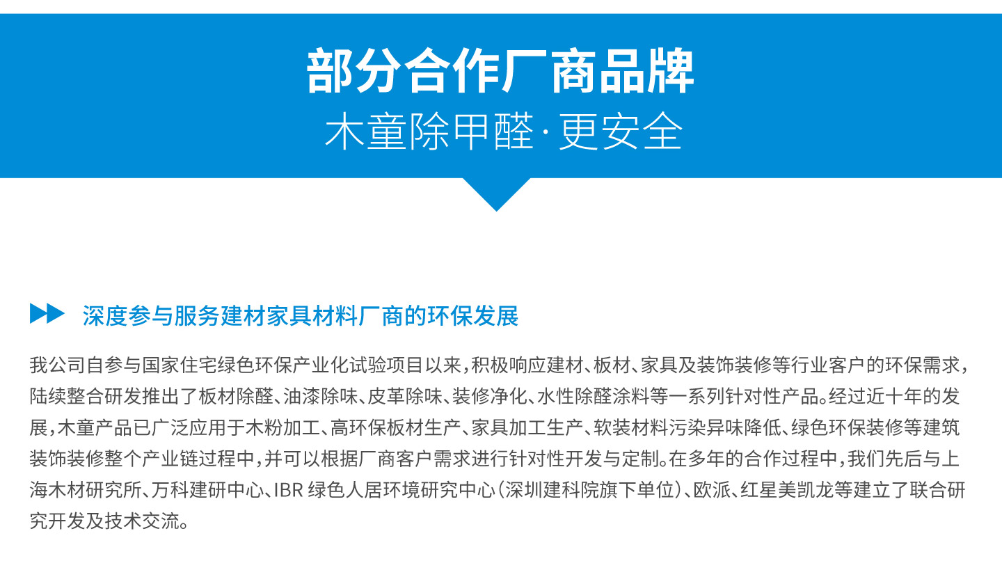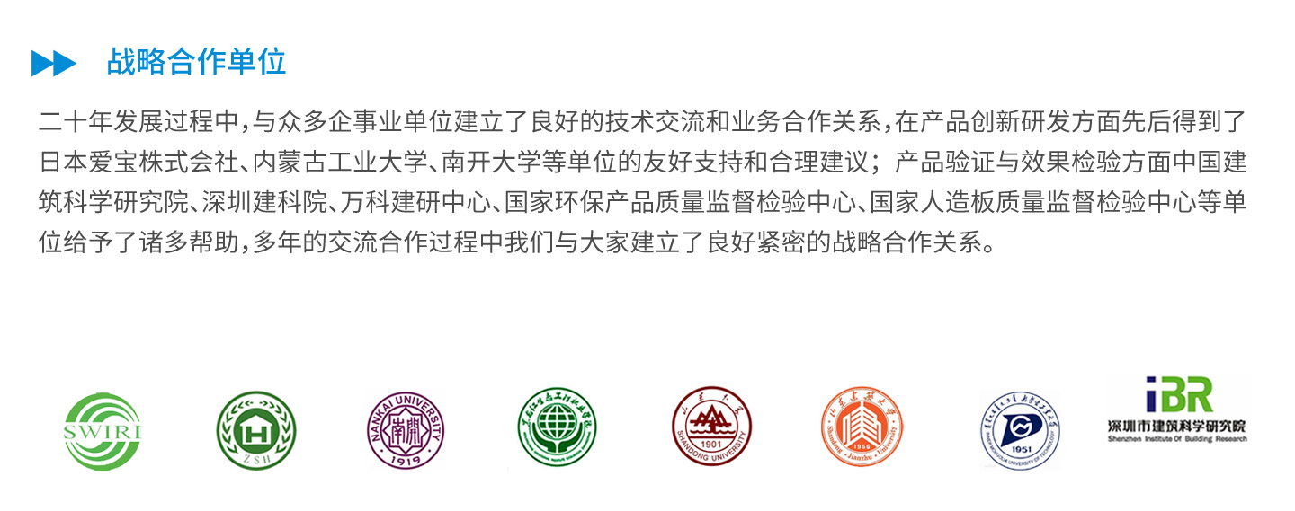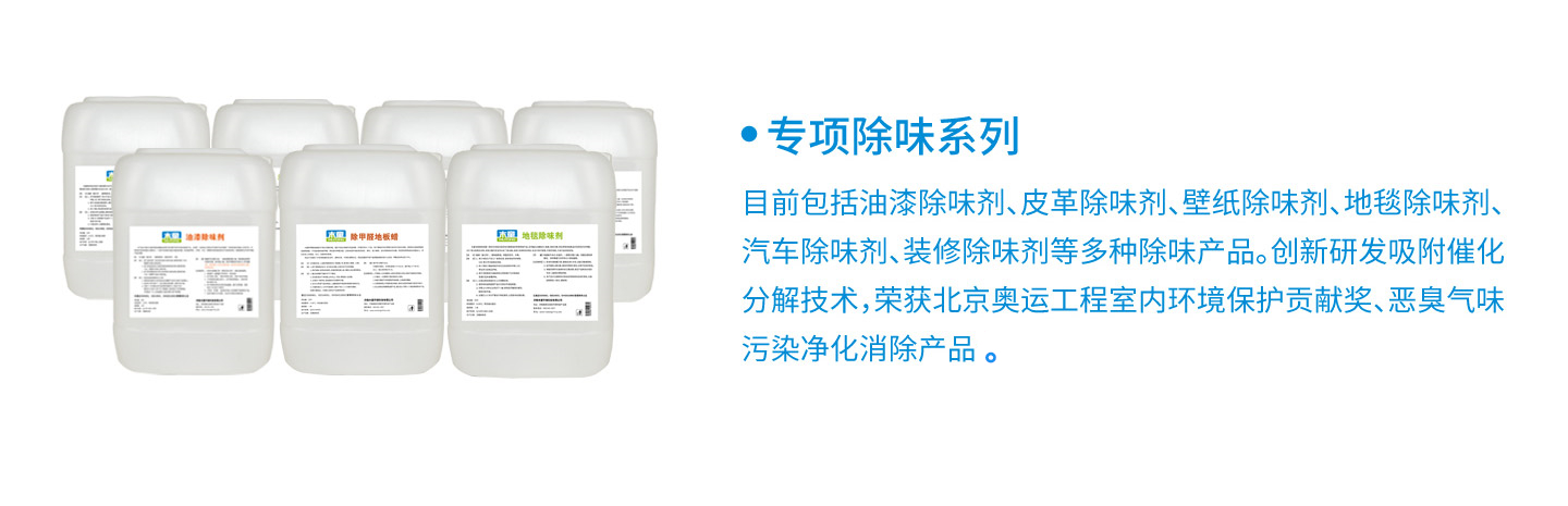 公司成立于2000年,專(zhuān)業(yè)致力于室內(nèi)環(huán)保產(chǎn)品的研發(fā)生產(chǎn)和銷(xiāo)售服務(wù)。已申請(qǐng)并擁有自主研發(fā)專(zhuān)有技術(shù)8項(xiàng),其中5項(xiàng)為技術(shù)配方,并成功地將其轉(zhuǎn)化為成熟穩(wěn)定的除醛除味產(chǎn)品,廣泛應(yīng)用于綠色建筑、環(huán)保裝修、家具板材除醛除味、汽車(chē)皮革布藝環(huán)保提升、室內(nèi)空氣污染凈化治理等多個(gè)領(lǐng)域中。其中,我公司是行業(yè)內(nèi)人造板甲醛清除劑產(chǎn)品的技術(shù)企業(yè),除甲醛水性涂料、除甲醛地板蠟產(chǎn)品的研發(fā)創(chuàng)新企業(yè),國(guó)家綠色建筑產(chǎn)業(yè)化示范參與企業(yè),住宅裝修污染控制解決方案供應(yīng)服務(wù)商。