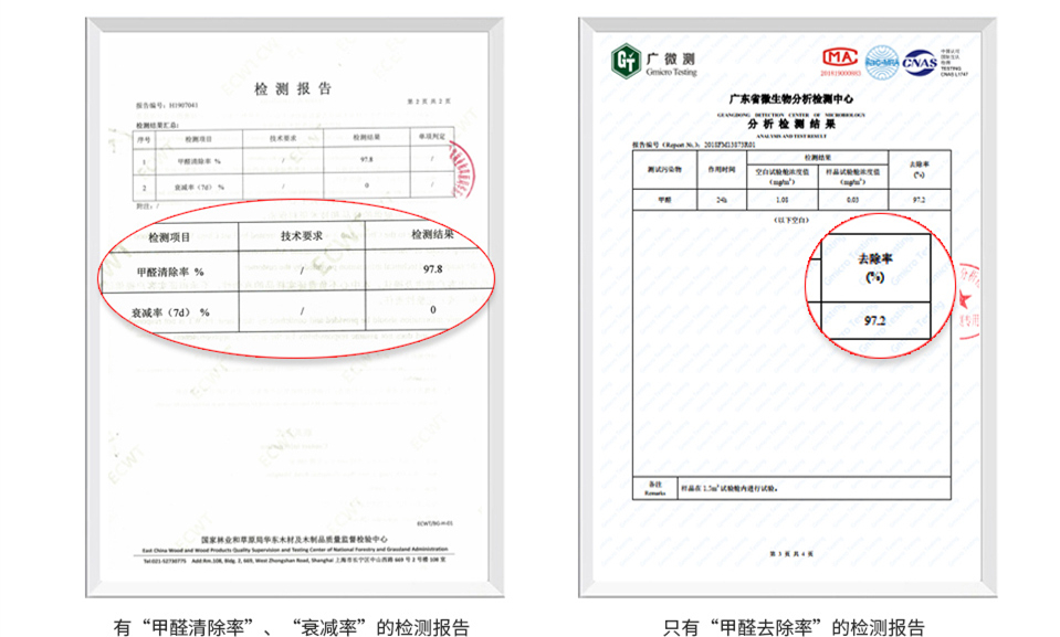 人造板甲醛清除劑的檢測報告,都會標示出2個數值:一個是“甲醛清除率”,一個是“衰減率”;空氣凈化用甲醛清除劑的檢測報告只有1個數值:“甲醛去除率”。