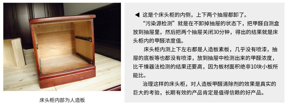 污染源檢測是我在2014年提出來的,既簡單又實用的檢驗除甲醛產品效果、確認污染源的方法。污染源檢測就是用甲醛自測盒檢測家具內,找出那些甲醛超過0.3毫克、0.4毫克,甚至超過0.6毫克的家具,這些甲醛濃度高的家具就是污染源。