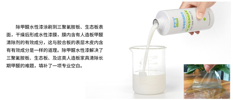 因此,如果用人造板甲醛清除劑涂刷三聚氰胺板、或油漆表面,有效成分只能停留在表皮的外面,一旦清潔家具,有效成分就被擦除,除甲醛的作用就沒了。對于這個難題,我們于2006年就開始研發(fā)除甲醛的水性涂料,直到2017年這款產品各方面性能才達到我們認可理想效果,推向了市場。從產品性質上說這款產品屬于水性涂料、水性漆。
