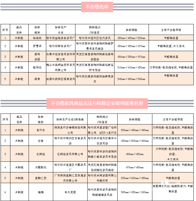 4月23日,黑龍江省哈爾濱市市場(chǎng)監(jiān)督管理局官網(wǎng)通報(bào)2017年流通領(lǐng)域家具商品質(zhì)量抽查檢驗(yàn)結(jié)果情況,共抽檢家具50個(gè)批次,不合格率為22%。不合格項(xiàng)目涉及甲醛釋放量、漆膜附著力、柜類穩(wěn)定性。