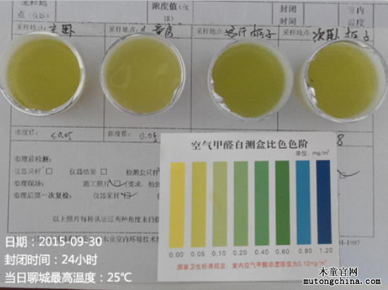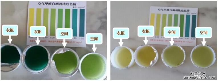 這兩張照片是2014年客戶按照“除甲醛三步法”治理家中甲醛污染,治理前后拍的照片。這四個檢測盒兩個是檢測衣柜內(nèi)的結(jié)果,兩個是檢測臥室空間的結(jié)果。