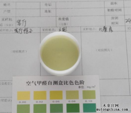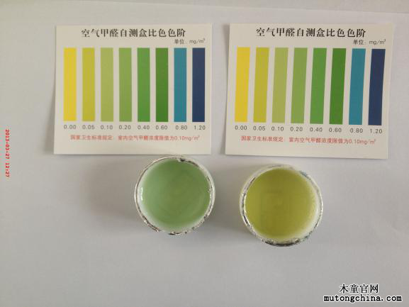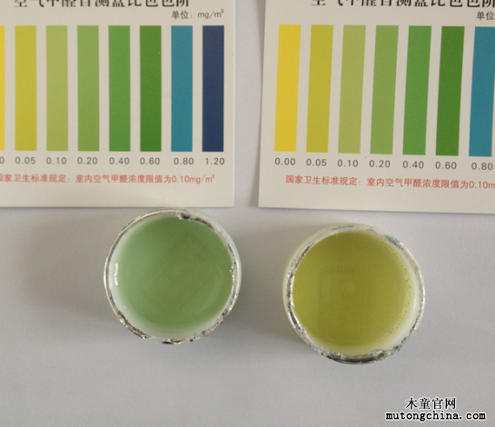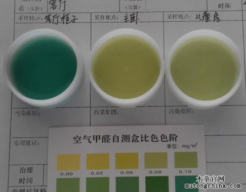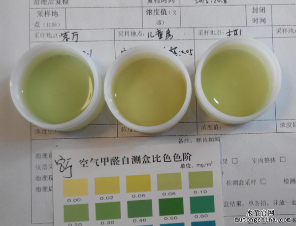 下面這張照片顯示的是在木童工程師實施了甲醛污染治理后的檢測結(jié)果。從左至右分別是客廳、兒童房、主臥三個房間檢測結(jié)果,試劑顏色非常接近,差異微小,但卻依然清晰可辨:客廳最接近0.1毫克,主臥與0.08接近,兒童房在0.02-0.05毫克之間。細(xì)小的差異全都顯現(xiàn)了出來。