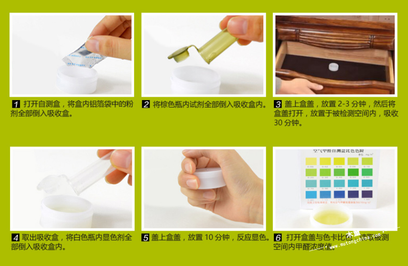 家具檢測:加入顯色劑后,蓋上蓋,放入家具中10分鐘,然后開蓋與比色卡對比。放置時間過短,試劑沒有充分反應(yīng),顏色不準(zhǔn)確;放置時間過長,試劑變色,也會導(dǎo)致判斷失誤。