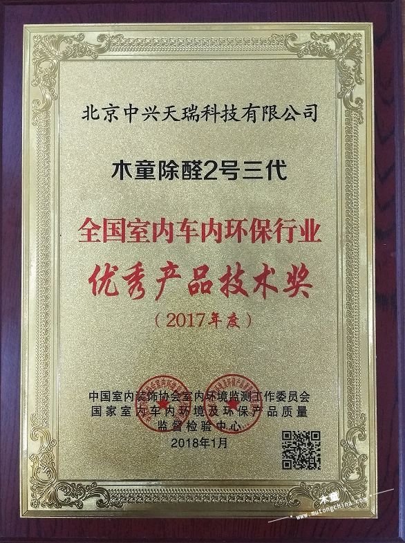 在此次會議上,我北京中興天瑞科技有限公司自主研發(fā)生產(chǎn)的“木童除醛2號三代”獲得“全國室內(nèi)車內(nèi)環(huán)保行業(yè)優(yōu)秀產(chǎn)品技術(shù)獎”。