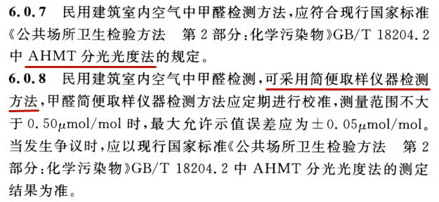 甲醛檢測允許使用經(jīng)過定期校準(zhǔn)的便攜式檢測儀進(jìn)行檢測,當(dāng)發(fā)生爭議時(shí),應(yīng)以現(xiàn)行國家標(biāo)準(zhǔn)GB/T18204.2中AHMT分光光度法的測定結(jié)果為準(zhǔn)。