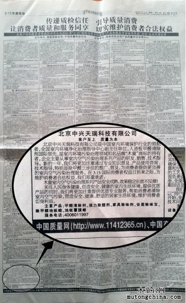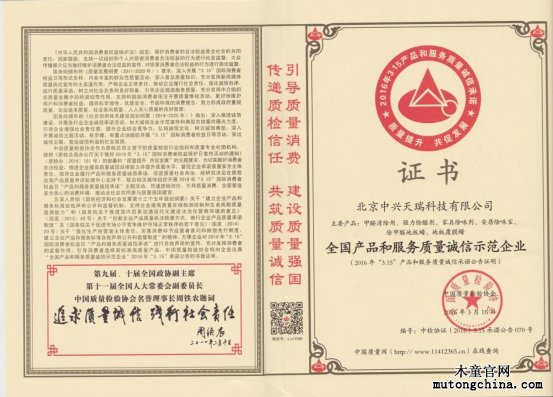 本次315活動(dòng)之際,我北京中興天瑞科技有限公司的甲醛清除劑、強(qiáng)力除醛劑、家具除味劑、安居除味寶、除甲醛地板蠟、地板覆膜蠟等產(chǎn)品,經(jīng)過(guò)中國(guó)質(zhì)量檢驗(yàn)協(xié)會(huì)與國(guó)家質(zhì)檢總局質(zhì)量申訴處理中心的抽查評(píng)審,榮獲“全國(guó)產(chǎn)品和服務(wù)質(zhì)量誠(chéng)信示范企業(yè)”。
