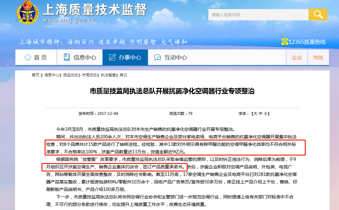 近日,上海法制日?qǐng)?bào)從市質(zhì)量技監(jiān)局執(zhí)法總隊(duì)獲悉,在總隊(duì)針對(duì)上海市生產(chǎn)銷售的抗菌凈化空調(diào)器行業(yè)為期5個(gè)月的專項(xiàng)整治中,發(fā)現(xiàn)“對(duì)外明示具有除甲醛功能的空調(diào)”不合格率達(dá)100%,涉案產(chǎn)品數(shù)量近13萬(wàn)臺(tái),貨值金額近9億元。截至11月底,海爾、奧克斯、國(guó)美、蘇寧等17家空調(diào)生產(chǎn)銷售企業(yè)及電商平臺(tái),已對(duì)281款抗菌凈化空調(diào)器產(chǎn)品落實(shí)整改。