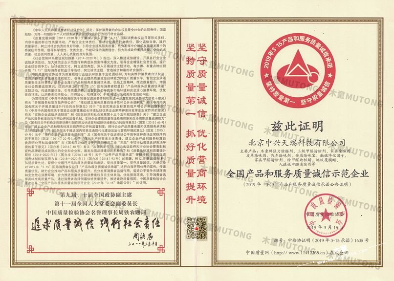 木童榮獲2019年全國產(chǎn)品和服務(wù)質(zhì)量誠信示范企業(yè)